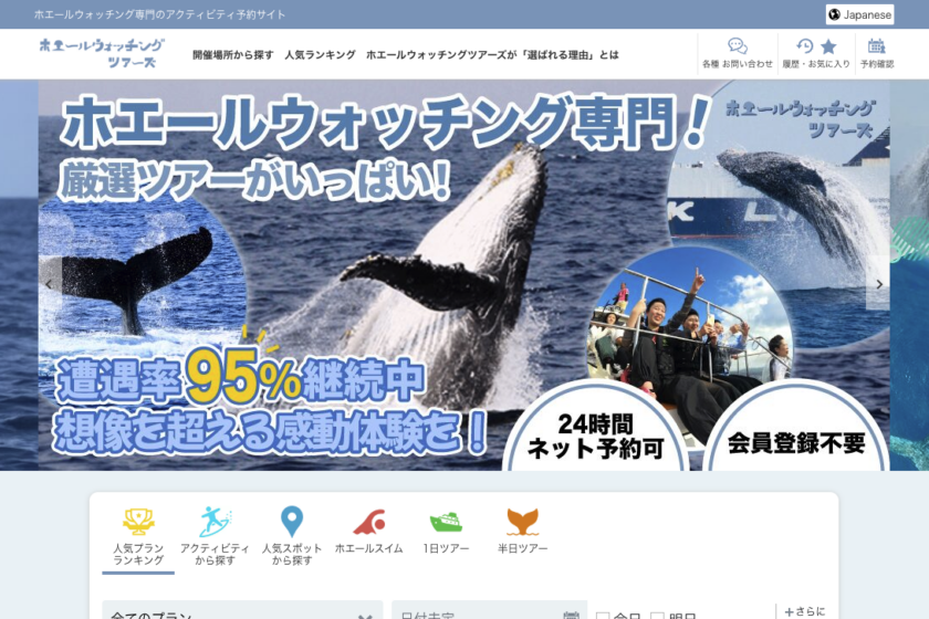 ホエールウォッチングツアーズは、「アクティビティ予約」と旅行前に知っておきたい「お得な観光情報」の提供を同時に行うことで観光客の不便を解消します。