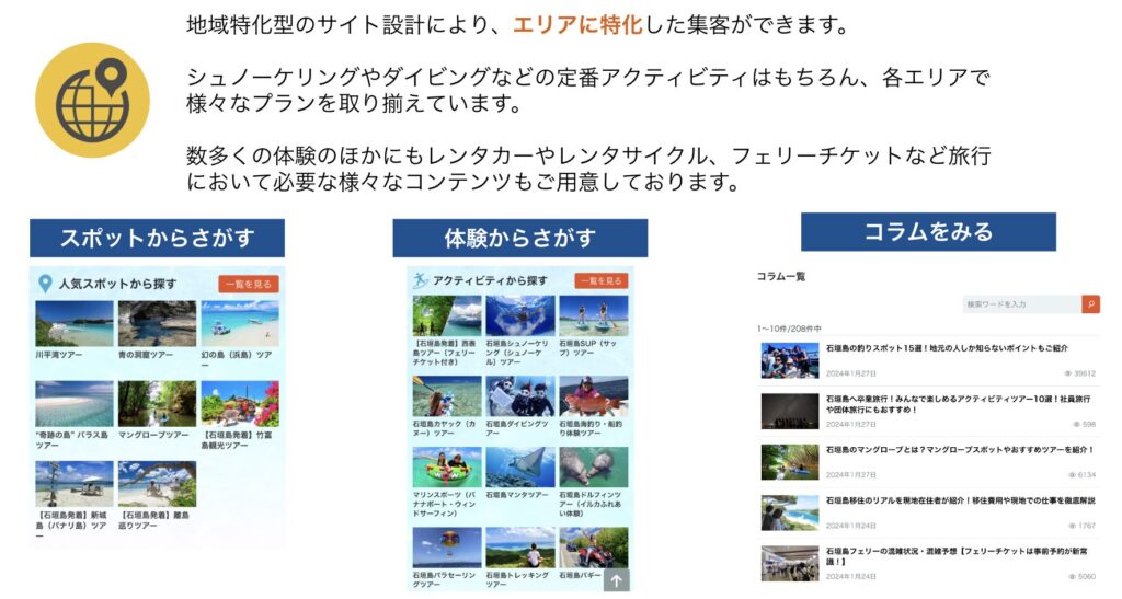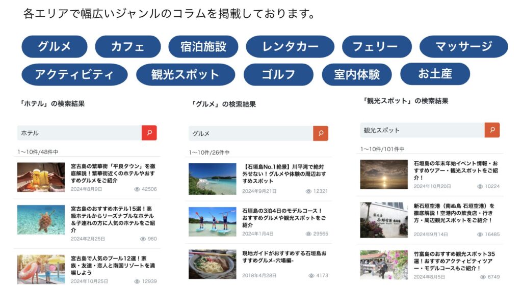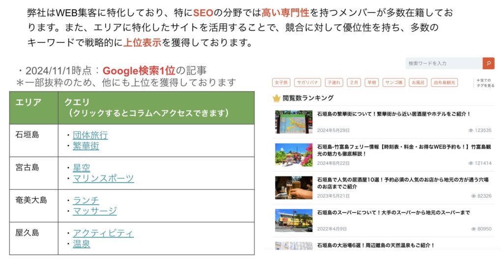 多数のコラムを取り扱っており、グルメ、祝初施設、観光スポットなどの多数のキーワードでSEO上位を獲得しております。